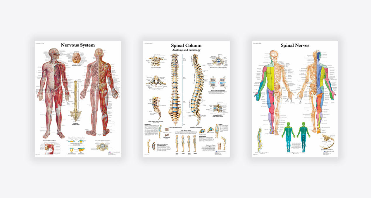 The Anatomical charts are thoughtfully designed visual tools to clearly convey essential medical information. Available in three options: Nervous System, Spinal Column, and Spinal Nerves, these charts provide doctors and healthcare practitioners with valuable resources for patient education.