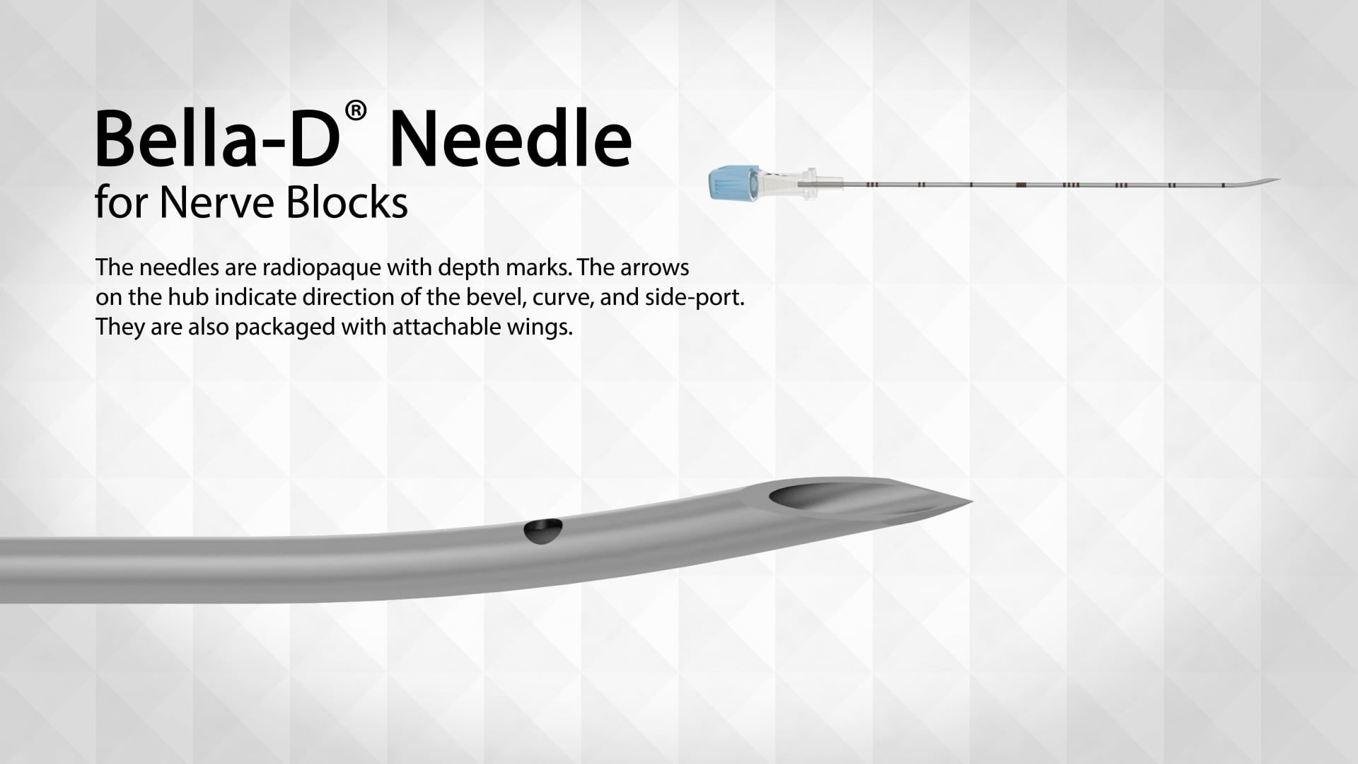 BELLA-D® Needles are perfect for use as a standard nerve block needle with additional features to benefit physicians during use. The needle also enables directional nerve blocks and other peripheral needle applications. With its patented design, including an occluded tip and a laser-drilled side opening for directional injections, the BELLA-D® Needle helps minimize the chance of unintended intra-arterial and/or intra-neural injections during targeted medication delivery. All BELLA-D® Needles come with attachable wings.