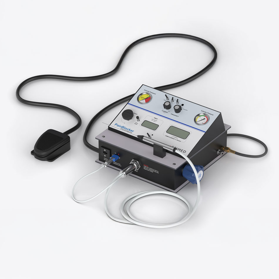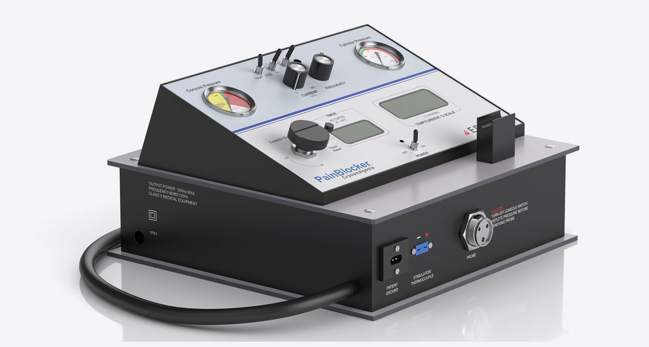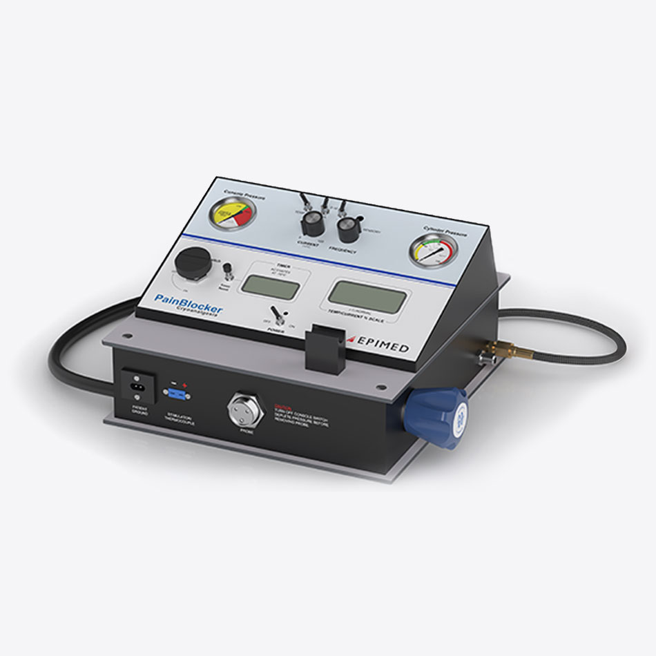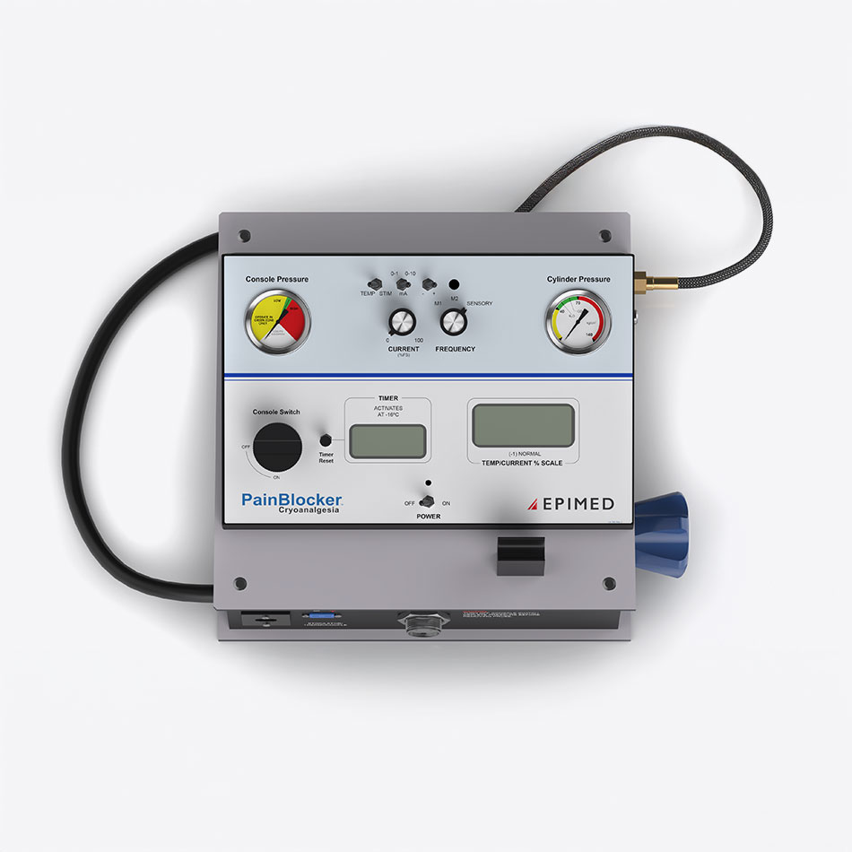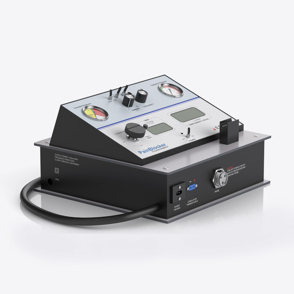 The PainBlocker™ is a cryoanalgesia system using the cryogenic properties of Nitrous Oxide (N2O) or Carbon Dioxide (CO2) in conjunction with the Joule-Thomson effect to create subzero temperatures which ablate nerves. The extent of injury is influenced by closeness of the freezing probe to the targeted nerve and increasing time (1-3 minutes range). Typical temperatures are -55 degrees for CO2 and -70 degrees for N2O (centigrade). Features: Regulator knob, Gauges to indicate gas pressures, Built in nerve stimulator, Operated by footswitch.