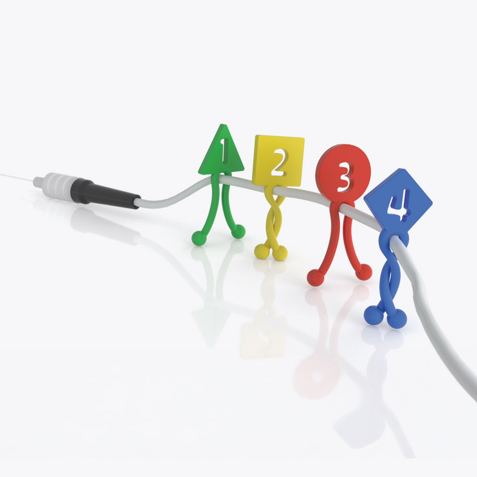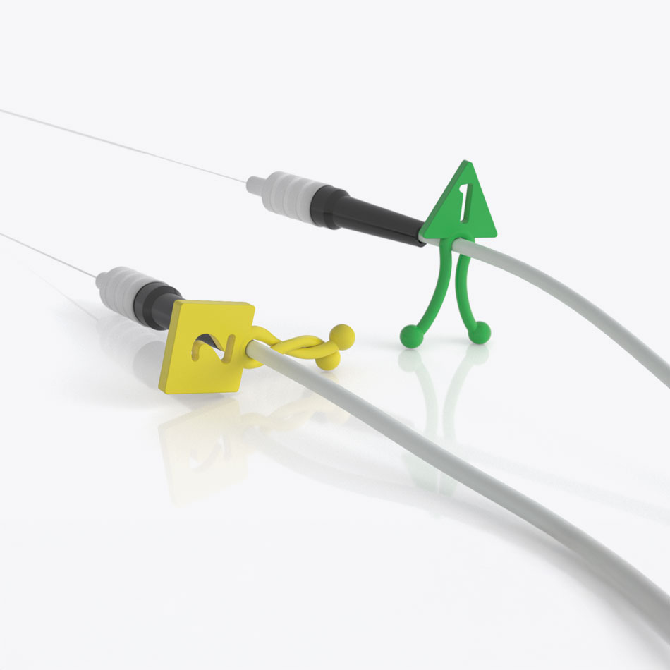 RF™ Probe Cable Marker Sets come with four color-coded cable identification markers. Non-sterile as shipped, RF™ Probe Cable Markers are autoclave compatible and reusable. Simply place a marker on the probe cable at the desired location and twist the nodes to interlock, and secure them in place.